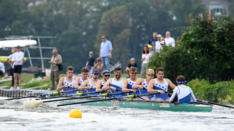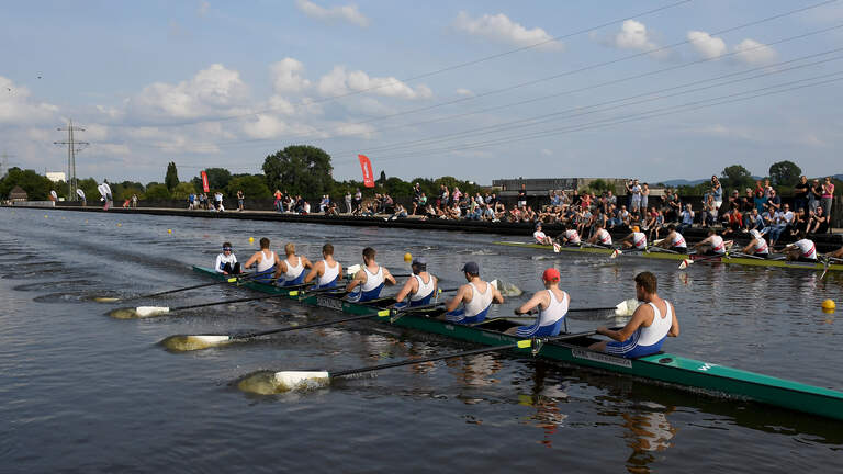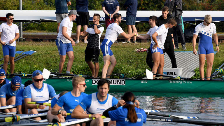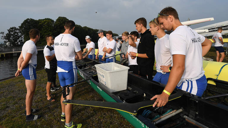 Beim morgendlichen Zeitfahren belegte das Team vom Dortmund-Ems-Kanal wieder nur den 16. Platz - bei insgesamt 17 gestarteten Booten. Im Hoffnungslauf mussten sie sich dann dem Achter aus Hanau geschlagen geben. Doch im Achtelfinale fuhr der Hansa-Achter einen deutlichen Sieg gegen den Kassel-Achter ein.