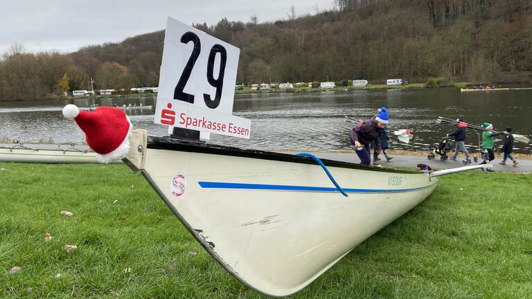 Gegen 11.00 Uhr setzen wir unser Boot „Vigour“ in die Ruhr ein. Nach einen kurzen Einrudern mit einer engen Wende über Backboard steuerte uns Volker zum Start. Wir zogen kräftig an, so dass wir bei voller Fahrt mit einem fliegenden Start auf die Strecke gingen. Der Rundkurs zwischen KRG und Mizwinkel hat insgesamt eine Streckenlänge von 4.000 m. Mit einer gekonnten Wende über Backboard nach der Streckenhälfte sicherte sich der RC Hansa den 4. Platz in einer Zeit 19:24,7 Minuten. Zur Belohnung überreichte uns am Steg der Nikolaus höchst persönlich einen Weckmann.