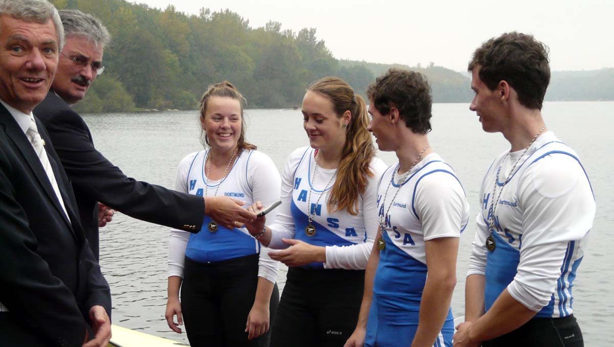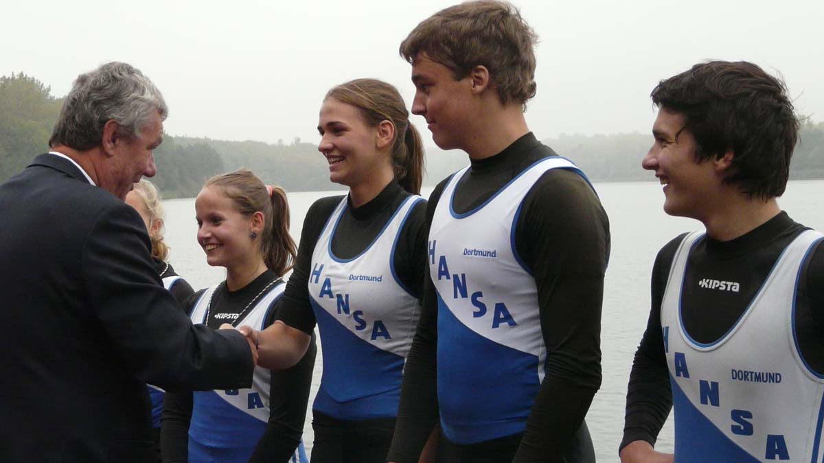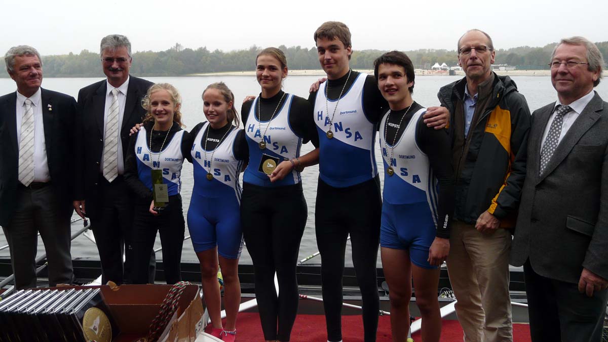 Da wollten auch die B-Junioren nicht nachstehen. In einem taktisch gut gefahrenen Rennen hatten Tabea Schendekehl, Jessika Preyss, Tim Bauerle, Simon Berkemeyer und Steuerfrau Laura Heinemann nach 1000 Meter im Ziel eine Länge Vorsprung vor den favorisierten Teams aus Krefeld und Essen sowie Witten, Essen (Boot 2) und Mülheim. Für diesen Erfolg der Nachwuchssportler erhielt der RC Hansa den Ehrenpreis der Landesregierung.