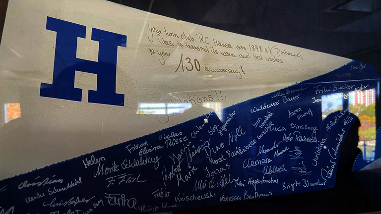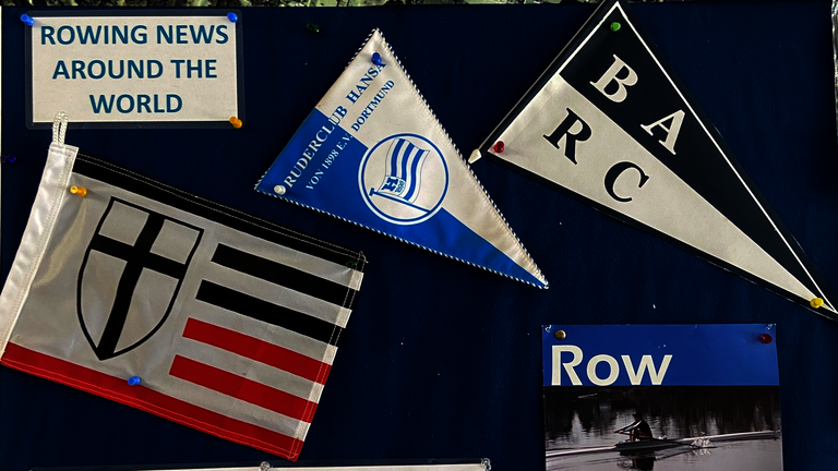 Als Luisa und ich unsere Reiseroute für Kanada planten und Toronto integrierten fiel uns auf, dass ja ganz in der Nähe, nämlich in Mississauga, unser Partnerclub, der Don Rowing Club liegt. Also nahmen wir mit Hilfe von Ulla Bremke den Kontakt zu Ernst Peters, einem Dortmunder Clubmitglied in Kanada auf und planten unseren Besuch. Nachdem wir in Kanada aufgrund neuer SIM-Karten erst noch Kontaktschwierigkeiten hatten, konnten wir unseren Besuch schließlich endgültig planen und machten uns mit dem (für unsere Verhältnisse riesigen) Vorstadtzug von Toronto aus auf in Richtung Mississauga. Dort angekommen waren wir nach 10 min laufen bereits am Credit River, fast an der Mündung zum Ontario See. Beide bilden zusammen das Ruderrevier des Don Rowing Club. Vor Ort wurden wir zunächst durch das Bootshaus geführt, hierbei war es für uns sehr ungewohnt eine ganze Bootshalle ausschließlich für private Boote und Skulls zu sehen. Natürlich gab es hier auch viele für uns bisher unbekannte Bootshersteller. Beim Rundgang konnten wir außerdem noch einige Wimpel und Gastgeschenke des RCHD entdecken.
