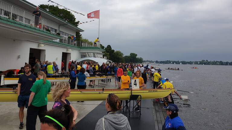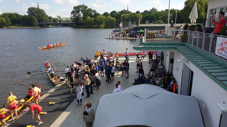 Trotz morgendlich durchziehender Gewitter und Sturmböen konnte pünktlich gestartet werden und um elf Uhr überquerten die ersten Boote die Startlinie. 24 gemeldete Teams waren mit jeweils zwei Booten und durchschnittlich dreißig Ruderern am Start und gaben ihr Bestes um innerhalb der nächsten acht Stunden möglichst viele Runden mit jeweils 3km Länge auf der gekennzeichneten Regattastrecke mit zwei langgezogenen Wenden über Außen- und Binnenalster zurückzulegen. Dabei sorgte aufgrund des teils böigen Windes die Alsterfontäne regelmäßig für eine angenehme Abkühlung im Rennen.