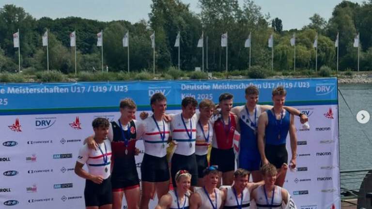 Lars Berkemeyer ist bei den Deutschen Meisterschaften nicht im Zweier ohne, sondern im Vierer ohne und im Achter der A-Junioren am Start gewesen. Im Vierer bildetet er mit Liam Kerstgens von der Rennrudergemeinschaft Mühlheim, Stephan Winterberg vom Ruderverein Waltrop und Luis Rübenstrunk vom Ruderclub Germania Dortmund ein Team. Die Vier schafften mit dem 3. Platz im Vorlauf nicht direkt die Qualifikation für das Finale. Aber mit Platz 1 im Hoffnungslauf zeigte das Team: Mit uns ist auch im Finale zu rechnen. Hier kämpften die Vier bis ins Ziel und konnten sich dafür mit der Bronze-Medaille belohnen.