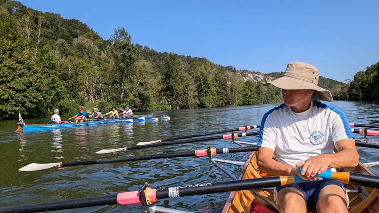 Unterhalb der großen Festungsanlage von Givet liegt der Ruderclub, dort setzten wir unsere Boote am Sonntagvormittag in die Maas ein. Dieses Mal waren Schwimmwesten für die Schleusen im Boot, da wir auf Nummer sicher gehen wollten, dass wir ohne Probleme geschleust werden.