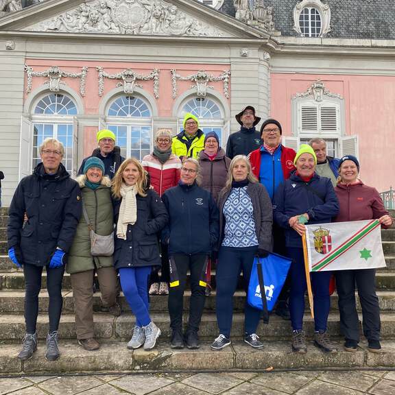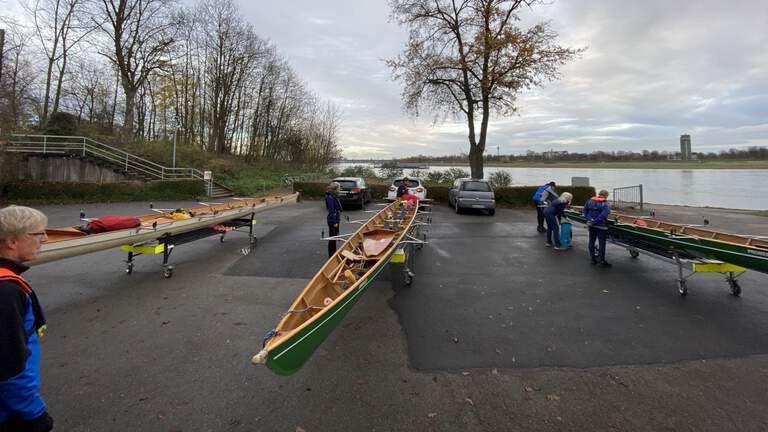 Um 14:00 Uhr trafen wir uns wieder an der Schlosstreppe und gingen zum Rhein zurück. Gemeinsam brachten wir die Boote zu Wasser und ruderten zurück zum Neusser Sporthafen. Die Hälfte der Gruppe saß hinterher im Bootshaus bei wärmenden und kühlen Getränken zusammen, und wir tauschten uns über die erfolgreiche Wanderfahrt aus.