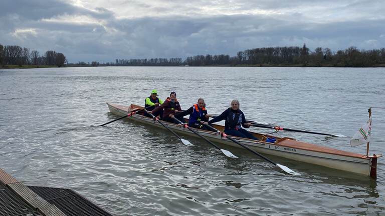 Für einige Nicht-Rhein-Ruderer war es die erste Fahrt auf dem Rhein. Zunächst ging es gegen die Strömung stromauf. Die Buhnen wurden von zwei Handsteuerleuten und einem Fußsteuermann schön ausgefahren. Unser Steuermann Michael Stoffels brachte uns während der Fahrt Wissenswertes über den Rhein bei – über seine Geschichte und darüber, wie eine sichere Ruderfahrt mit den speziellen Regeln und Voraussetzungen, z. B. Strömung und ungünstige Wetterverhältnisse, gelingt.